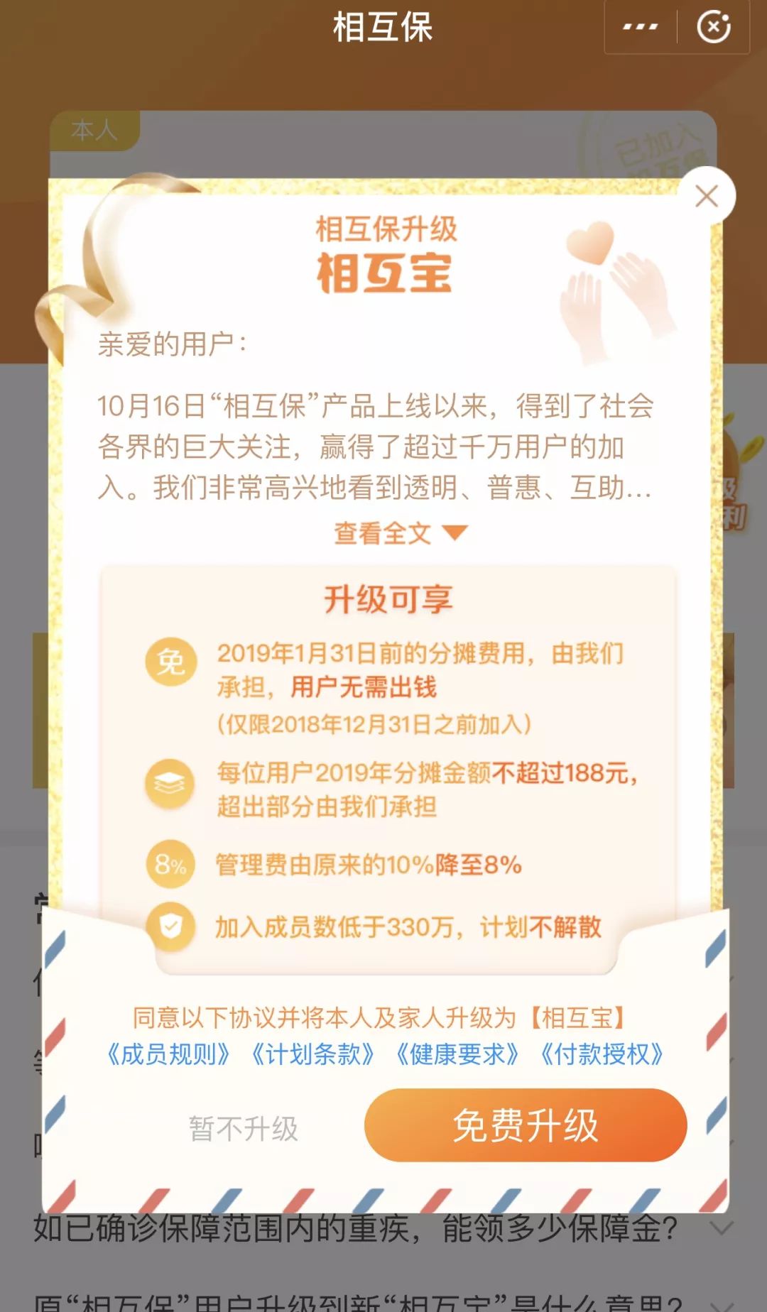 已经参加计划的用户,一键升级至新“相互宝”,等待期不用重新计算。