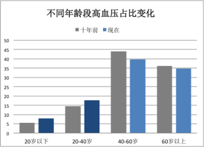 一、科普一下高血压的几点小知识 1、高血压呈现年轻化趋势 我们来看看十年前和现在各年龄段患高血压的比例: