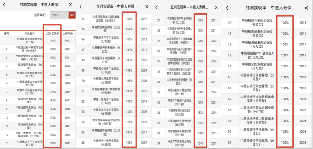 中意人寿之前的分红险产品,过去5年红利实现率均>100%,最高甚至达到247%!甚至连2003年上市的“20岁”老产品,目前的分红实现率也都能达到100%,这个成绩,只能说牛!