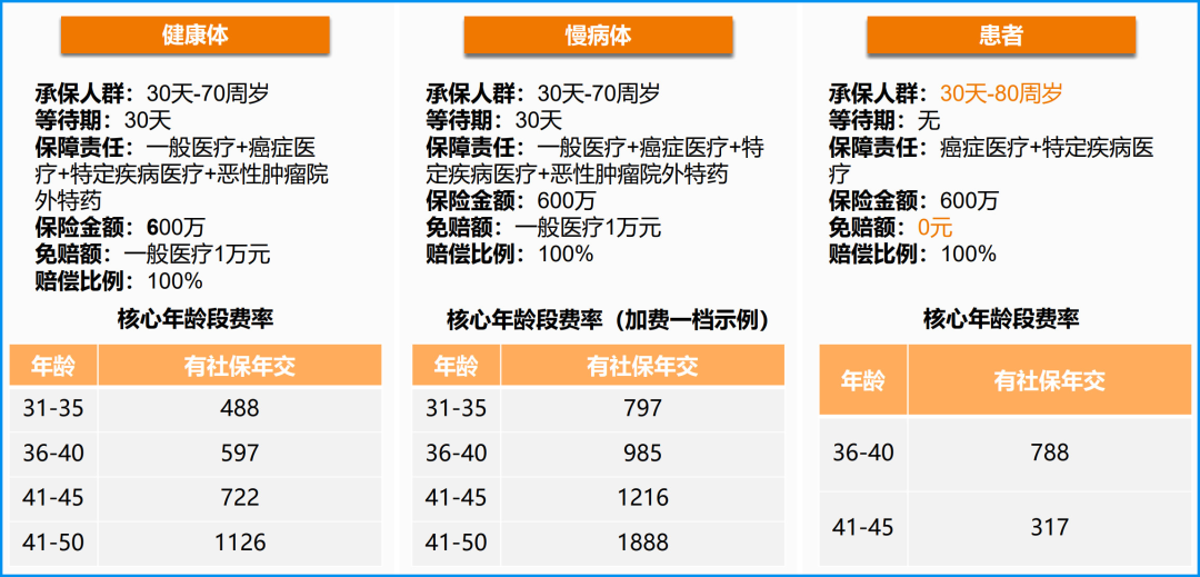 患者方案:最高80周岁可投保,只保恶性肿瘤+特定疾病医疗,130种“特定疾病”被拆分为5组,会根据被保人的健康状况,除外已罹患特定疾病组,承保剩余新发疾病,报销比例100%