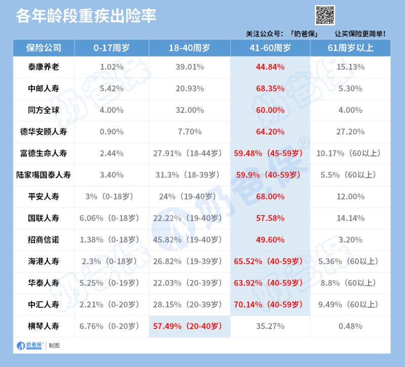 在41至60岁的年龄段,重大疾病的出险率在35%至70%之间,而18至40岁的年轻人群的出险率也不容小觑,大多在20%左右。