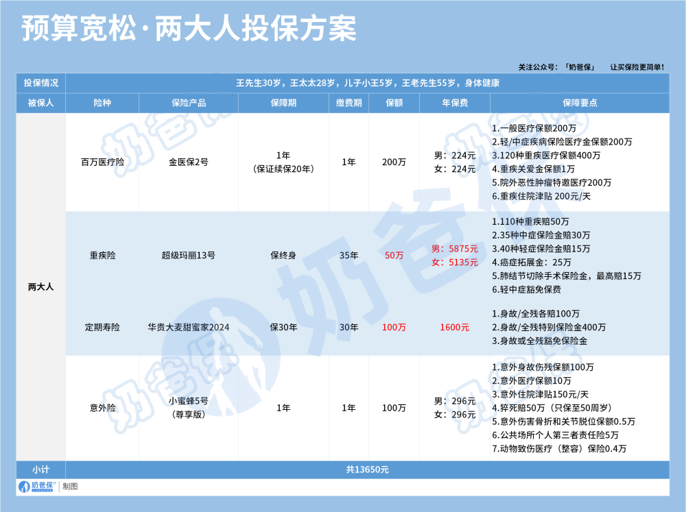 讲完了这些,奶爸将以一个保险方案的形式,为大家介绍一下一家五口买保险的思路。