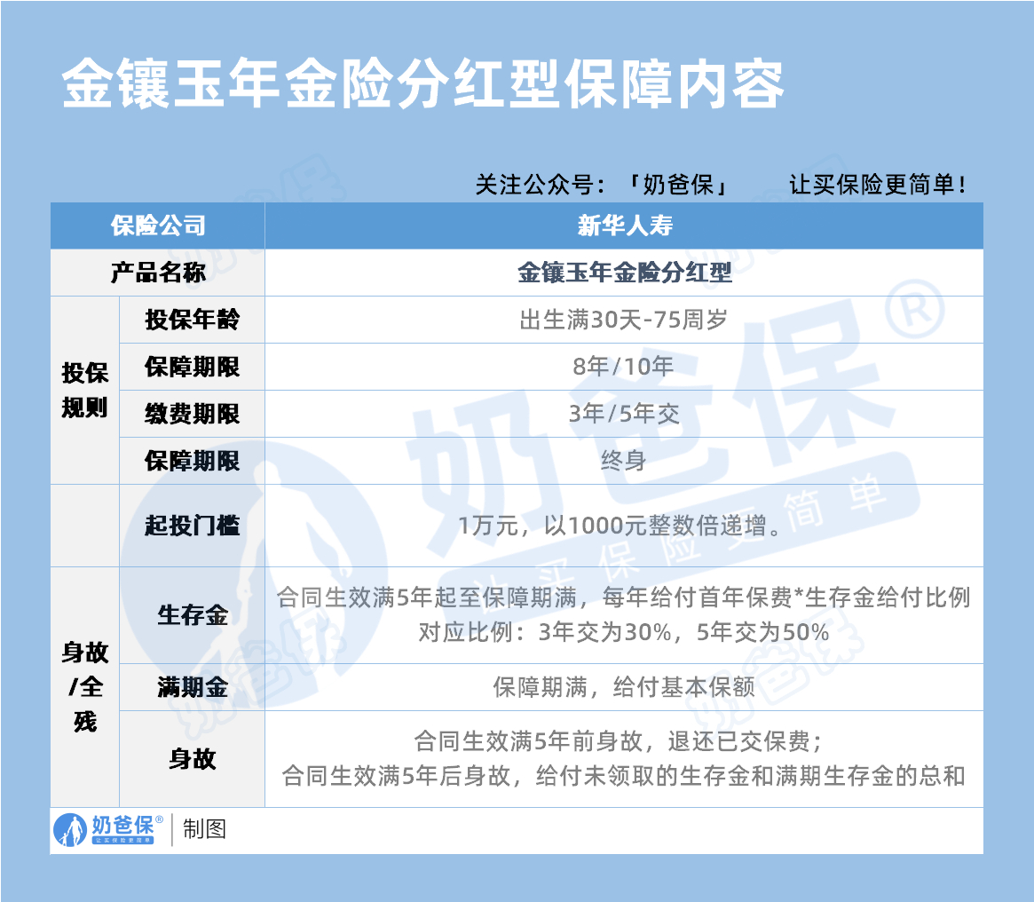 新华保险金镶玉年金险分红型产品兼具保障与理财兼顾的特点,通过短期交费和快速满期的设计,满足了大家对于资金安全性和增值性的需求。
