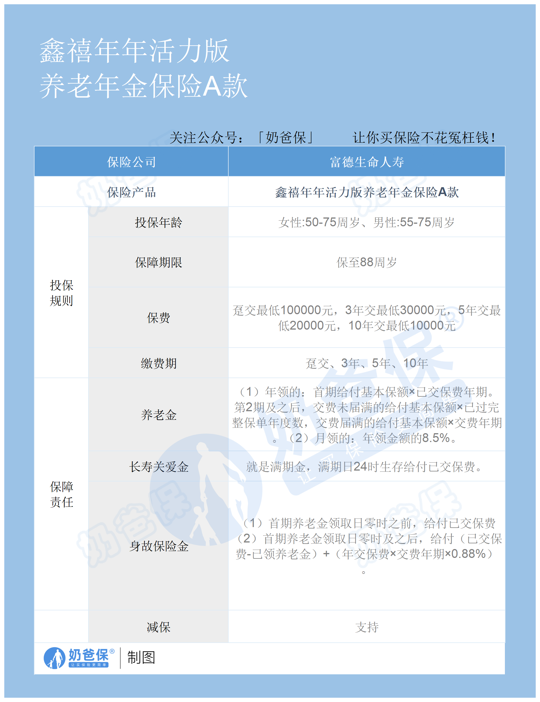 我们按照老规矩来看看富德生命鑫禧年年活力版养老年金保险A款的保障情况: