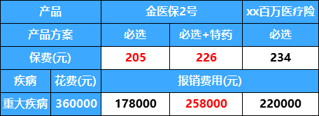 3. 对于重疾,金医保2号百万医疗在院外特药报销上不限是否经过社保报销,均按100%报销,而XX百万医疗险若未经过社保报销,报销比例仅为60%,金医保2号百万医疗在这一方面的赔付金额明显更多。