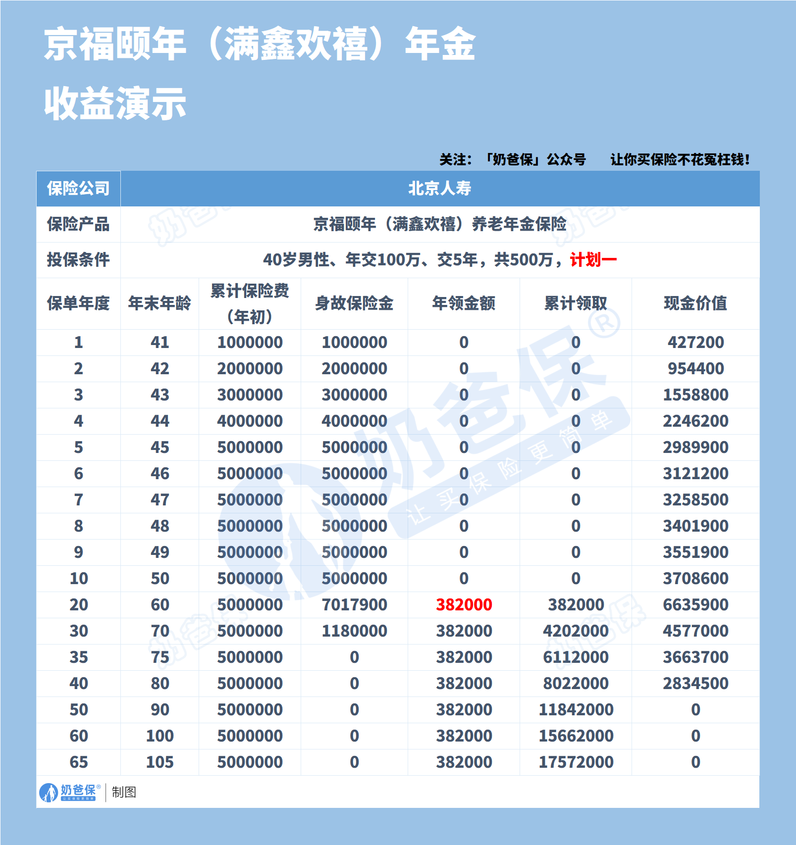 为了更直观地展示北京人寿京福颐年满鑫欢禧的收益情况,奶爸以一位40岁男性,年交100万,交5年,选择计划一为例进行详细演示。