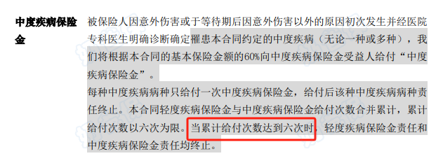 万一这6次出险的都是中症,等于最高可以拿到60%*6次=360%保额的赔付。