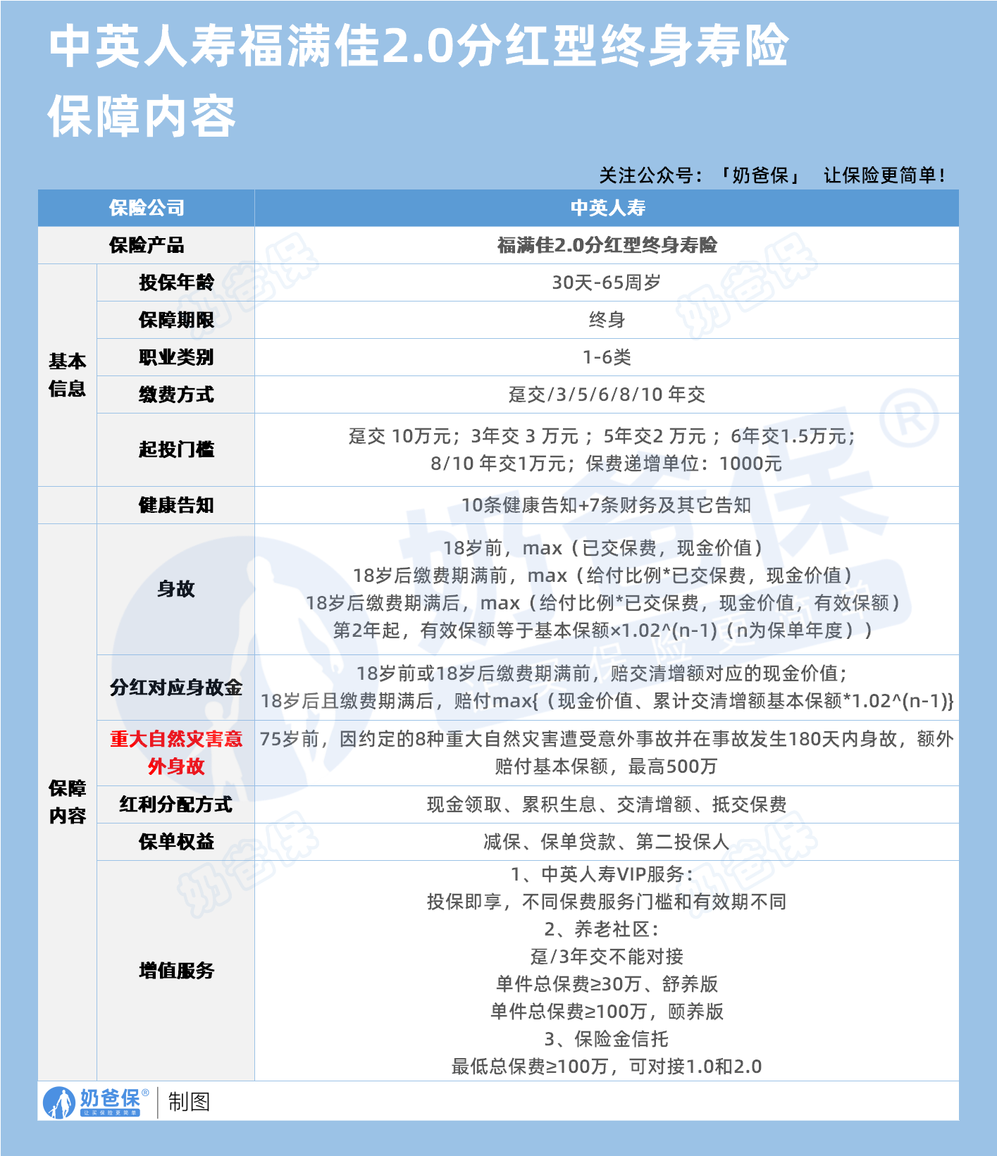下面奶爸将给大家介绍一下中英人寿福满佳2.0分红型终身寿险的亮点: