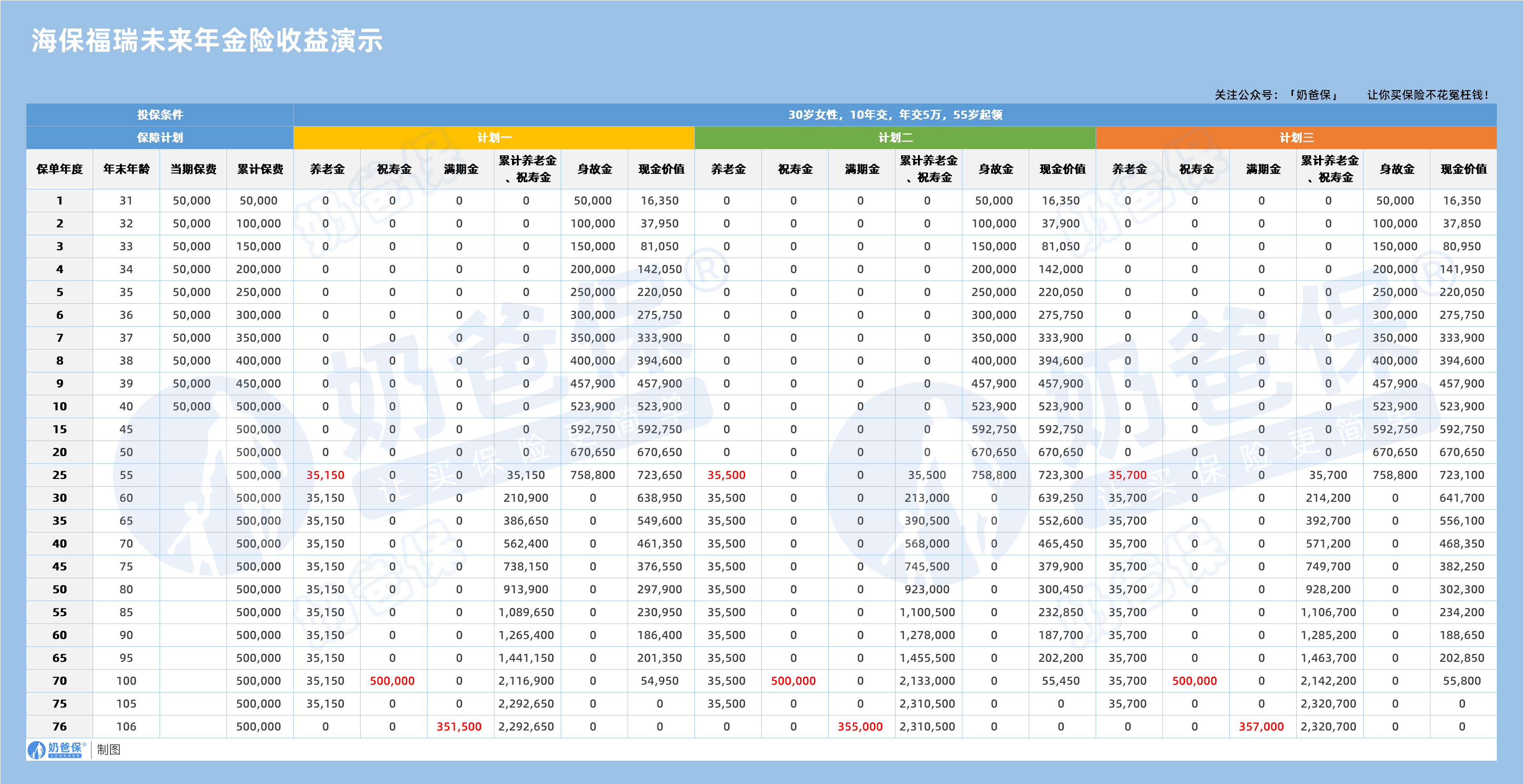 所有计划都可领取一笔祝寿金,金额是50万元,这极大地提升了总收益。