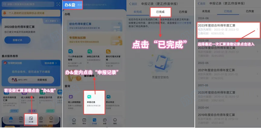 个税APP-底部菜单栏【办&查】-【申报记录】-【已完成】-选择上年度综合所得年度汇算