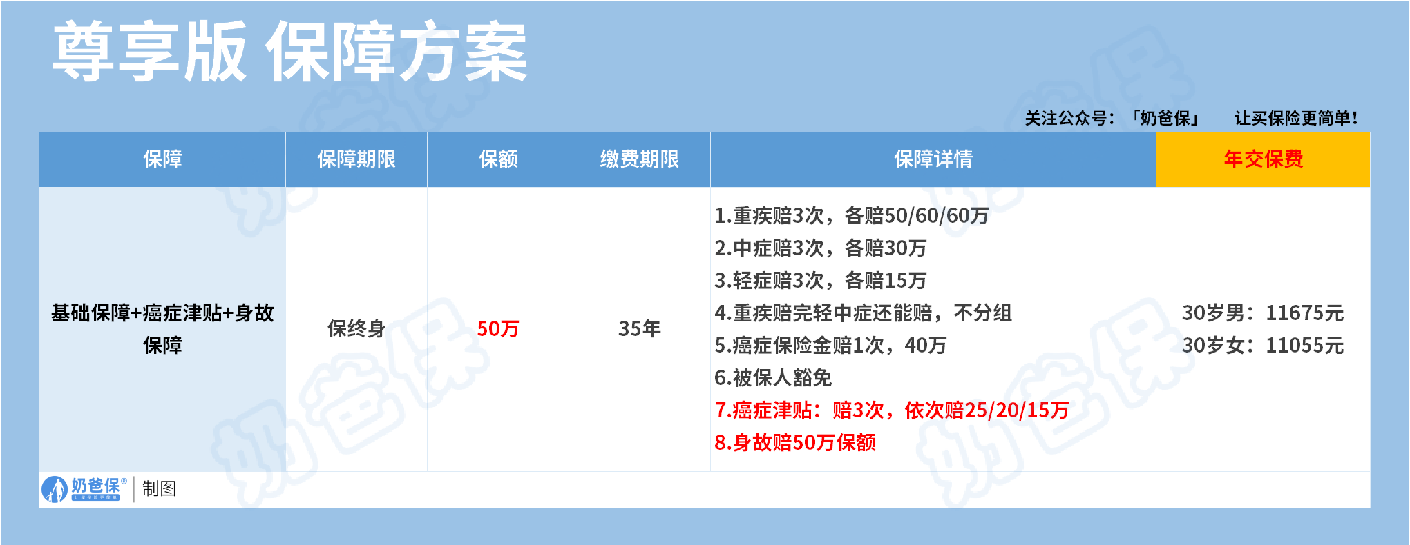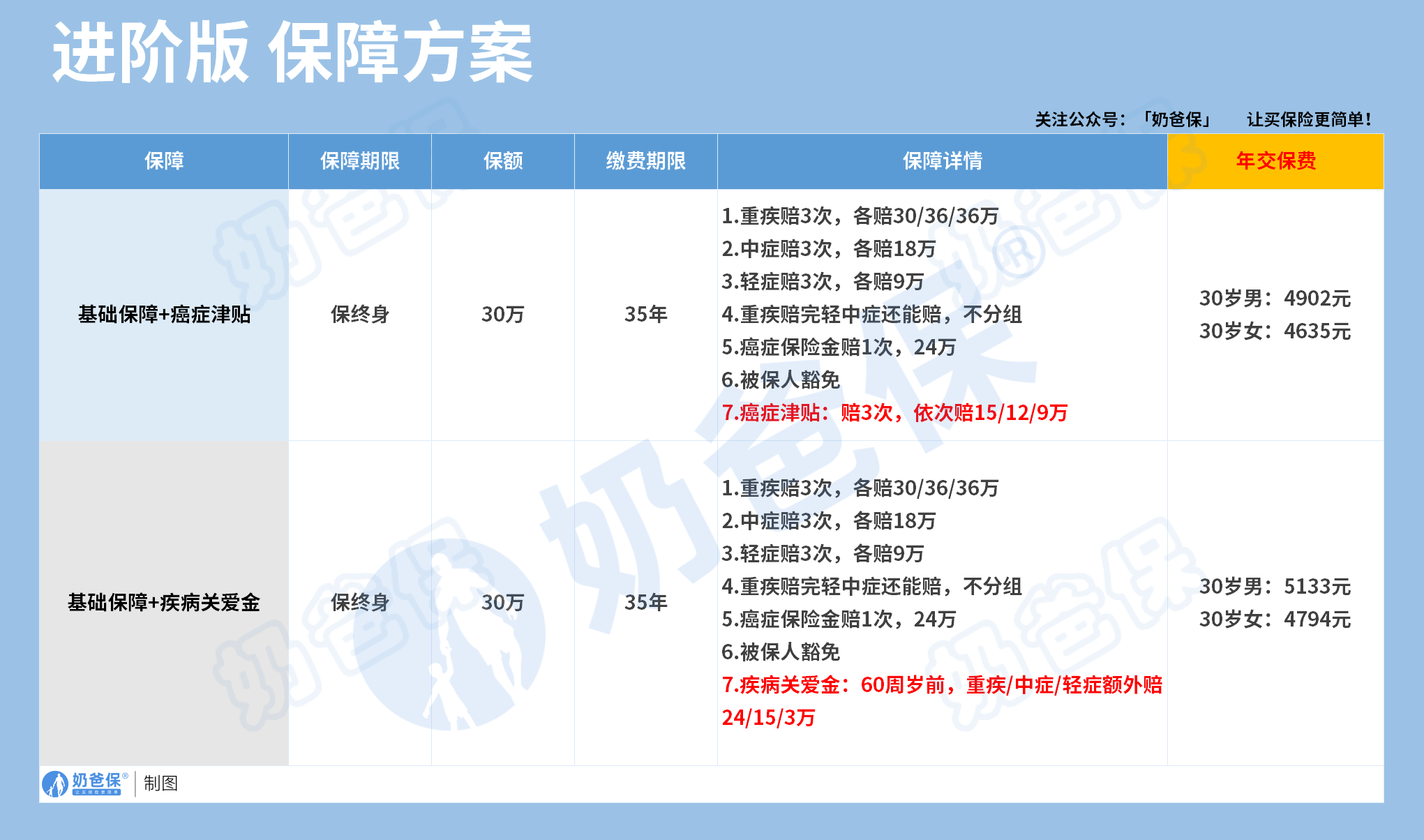 如果预算比较充裕,可以考虑把保额从30万→升级到50万,