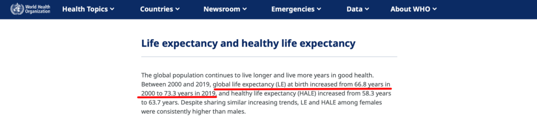 另一方面,人均寿命在不断提高。根据世界卫生组织数据,从2000年到2019年,人均预期寿命从66.8岁增长到了73.3岁。即每2.8年人均寿命增长1岁。