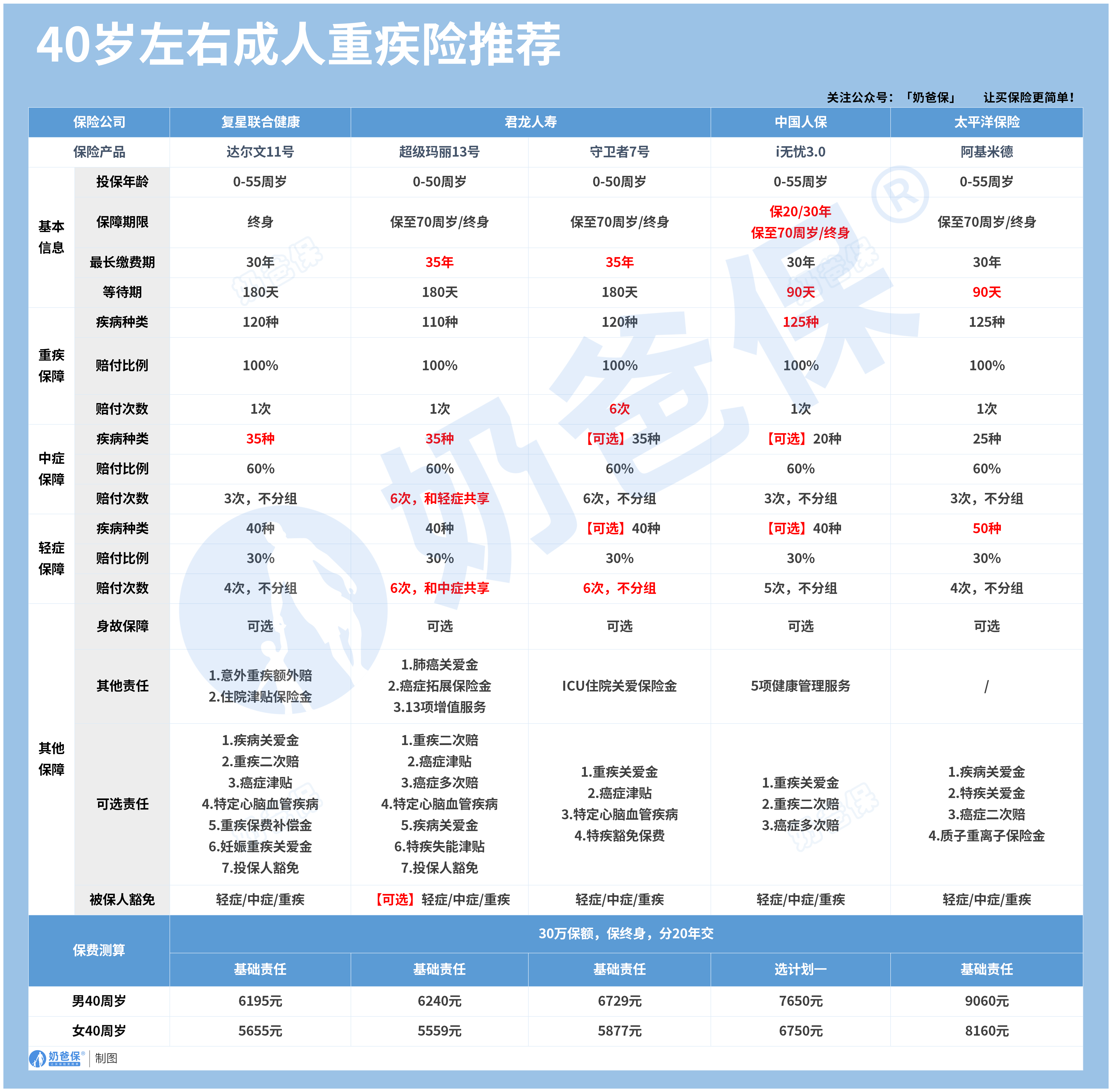 所以,40岁买重疾险很有必要,既是保费相对划算的“末班车”,身体条件也还允许,能更顺利投保。