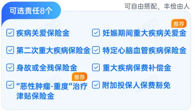 特色可选保障更贴心,考虑到孕期特殊情况、保费补偿及投保人豁免,对家庭保障很友好。