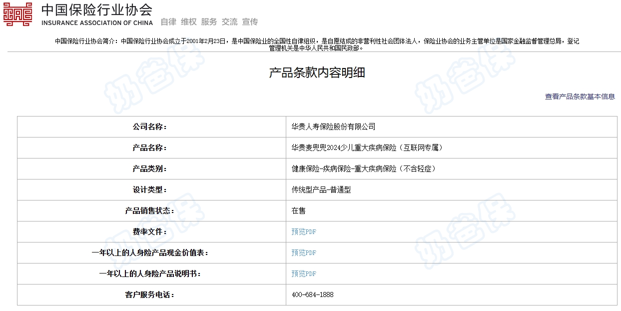该产品的备案名为“华贵麦兜兜少儿重大疾病保险(互联网专属)”,能够查询到其备案信息。