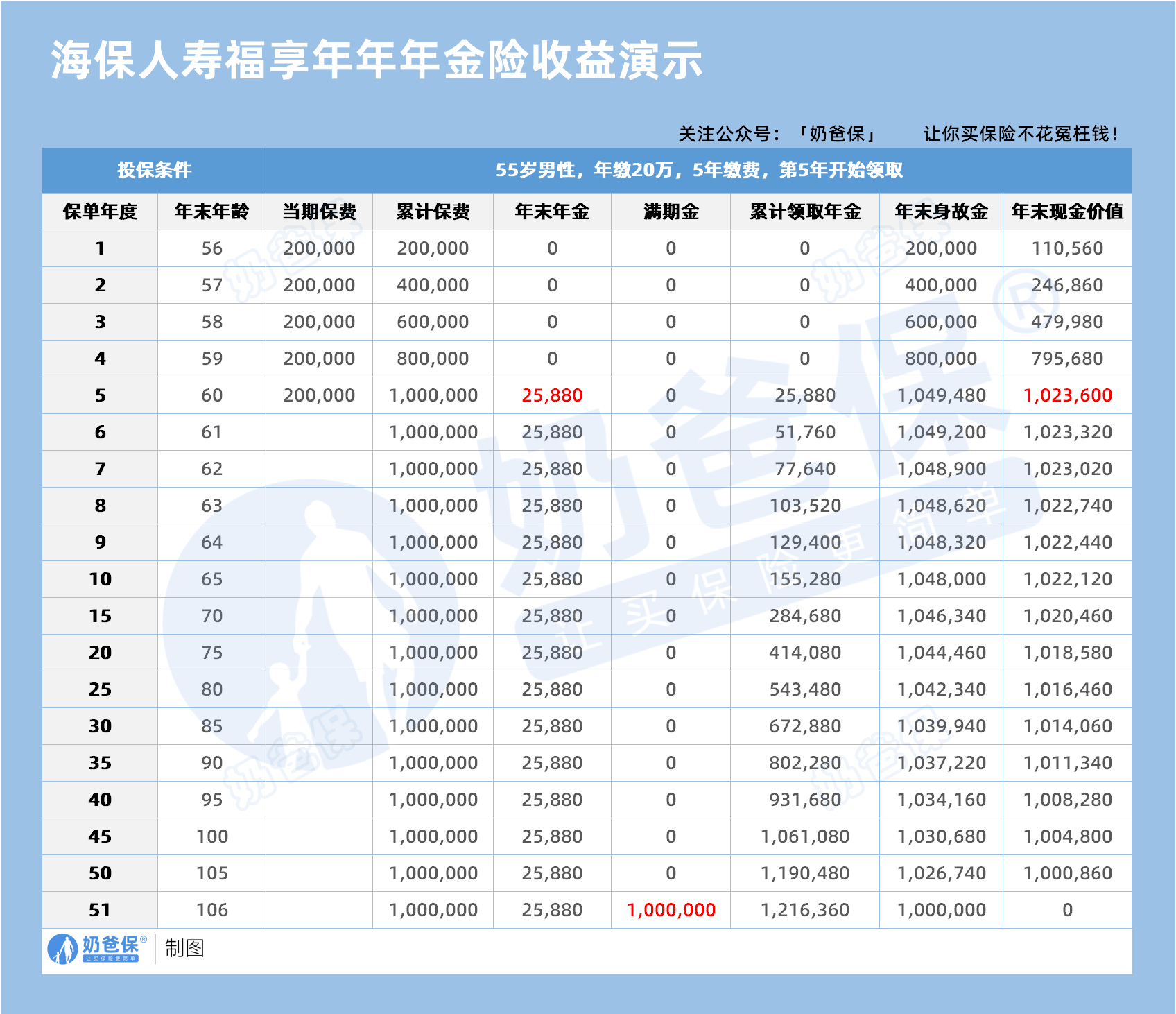 投保方案:55岁男性,趸交20万元,第5年起开始领取。