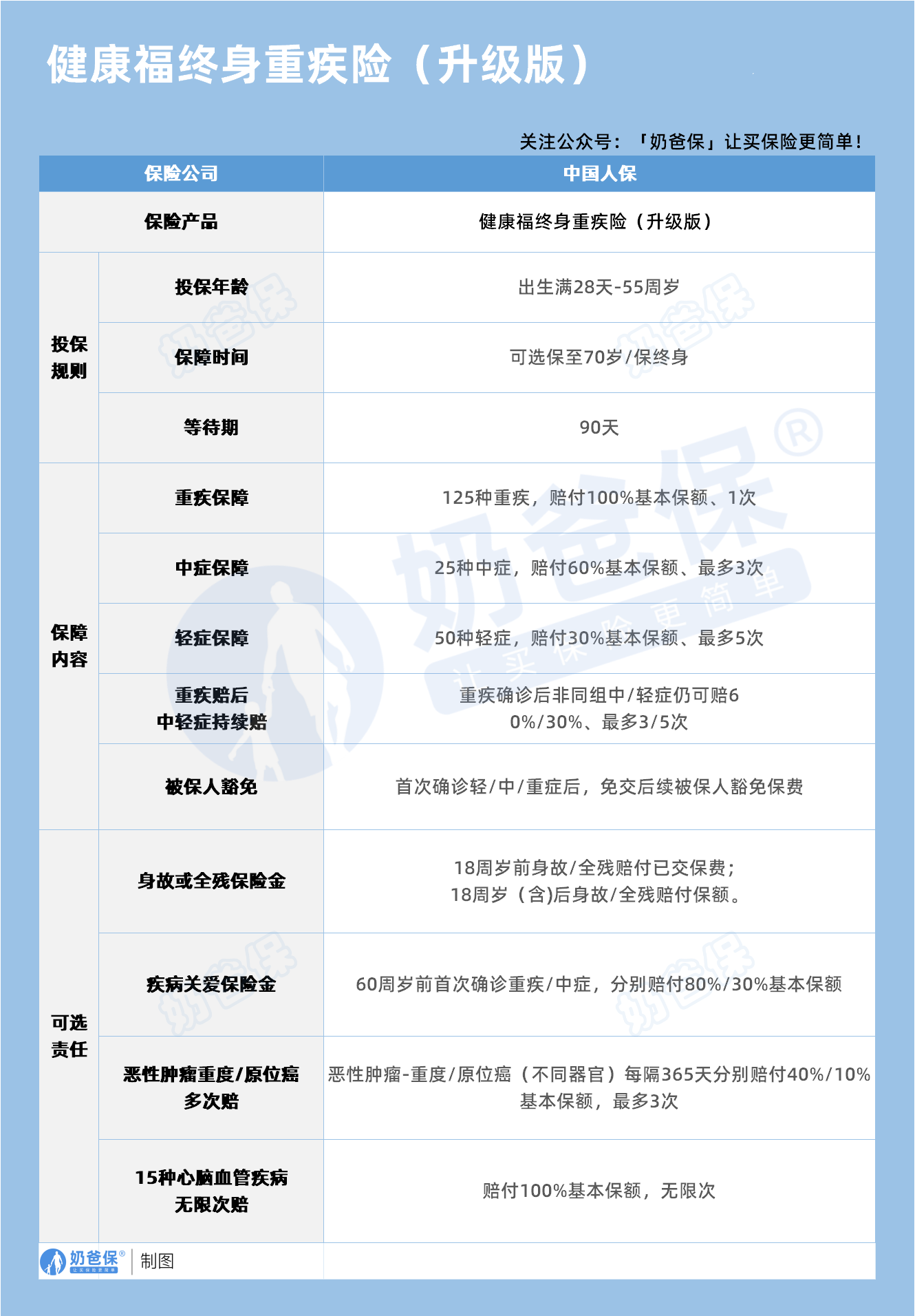 健康福终身重疾险升级版由人保健康承保,投保年龄为出生满28天(不含)至55周岁(含)。
