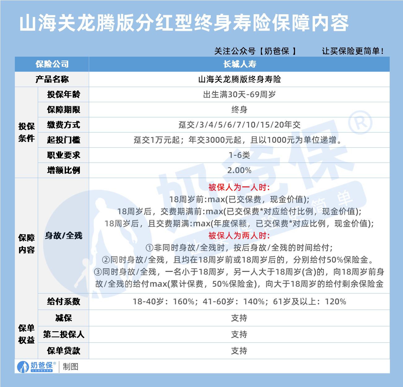 长城人寿山海关龙腾版终身寿险(分红型)增额比例为 2.00%,能提供相对稳定的收益,且兼具终身身故或全残保障与分红收益。