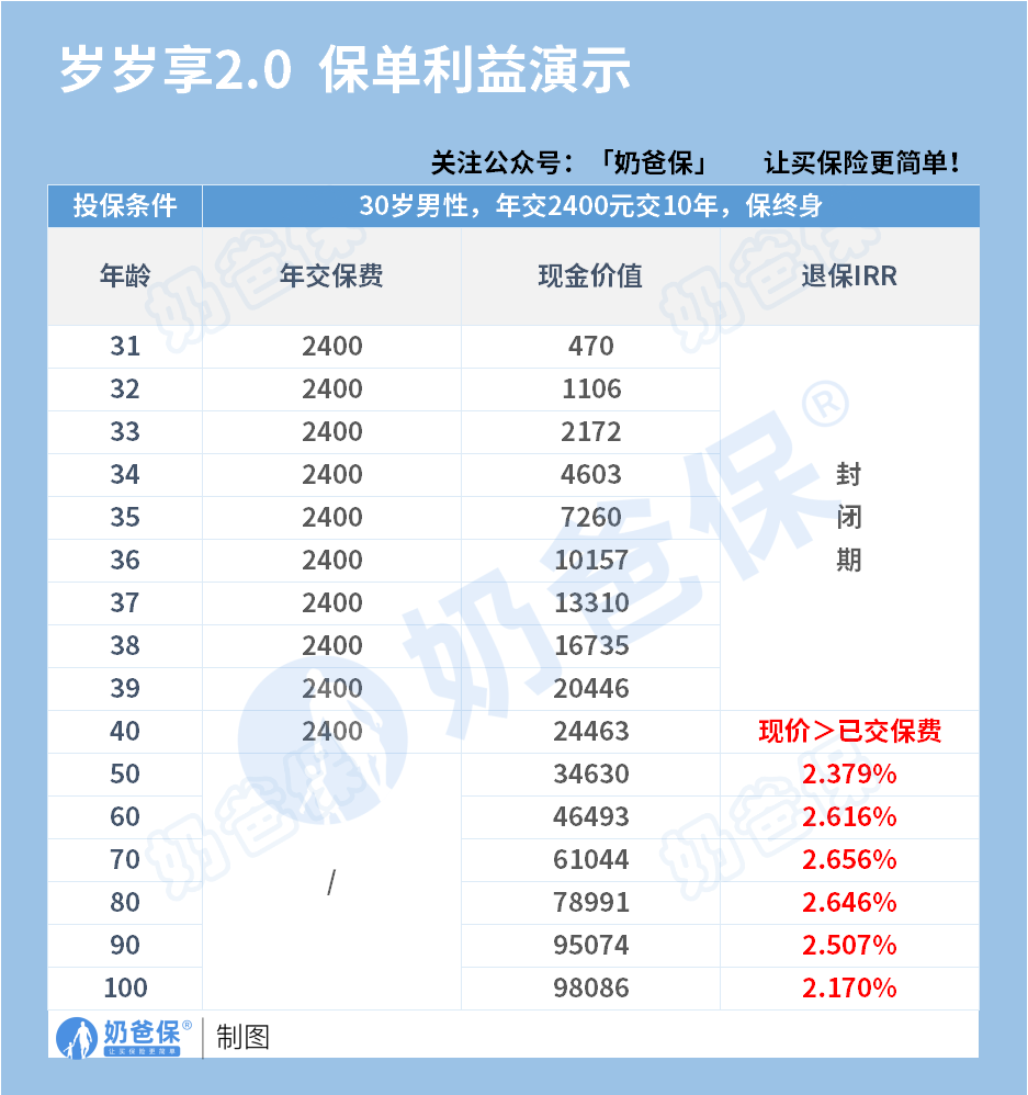 投保人70、80岁的时候,复利IRR达2.64%左右,为被保险人提供了长期的资金储备。