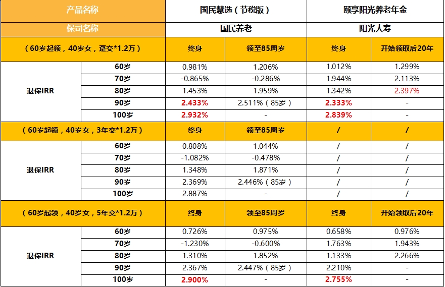短期(60-70岁):颐享阳光“领后20年”IRR达2.113%(60岁1.299%),国民慧选节税版养老年金险终身版60岁仅0.981%,前期颐享碾压;