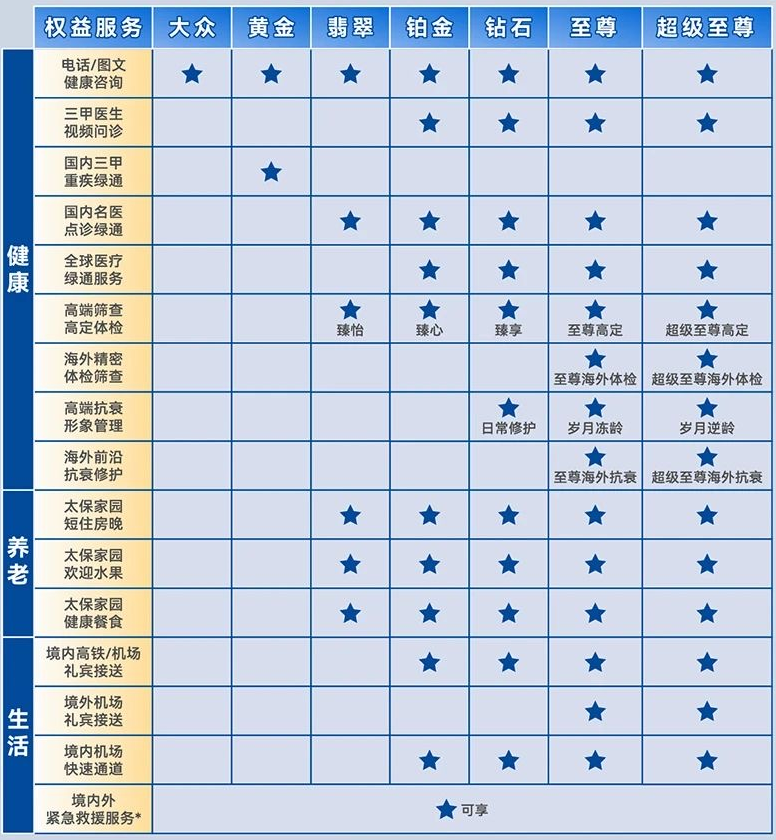比如国内三甲重疾绿通、高端筛查体检、境内外紧急救援等。