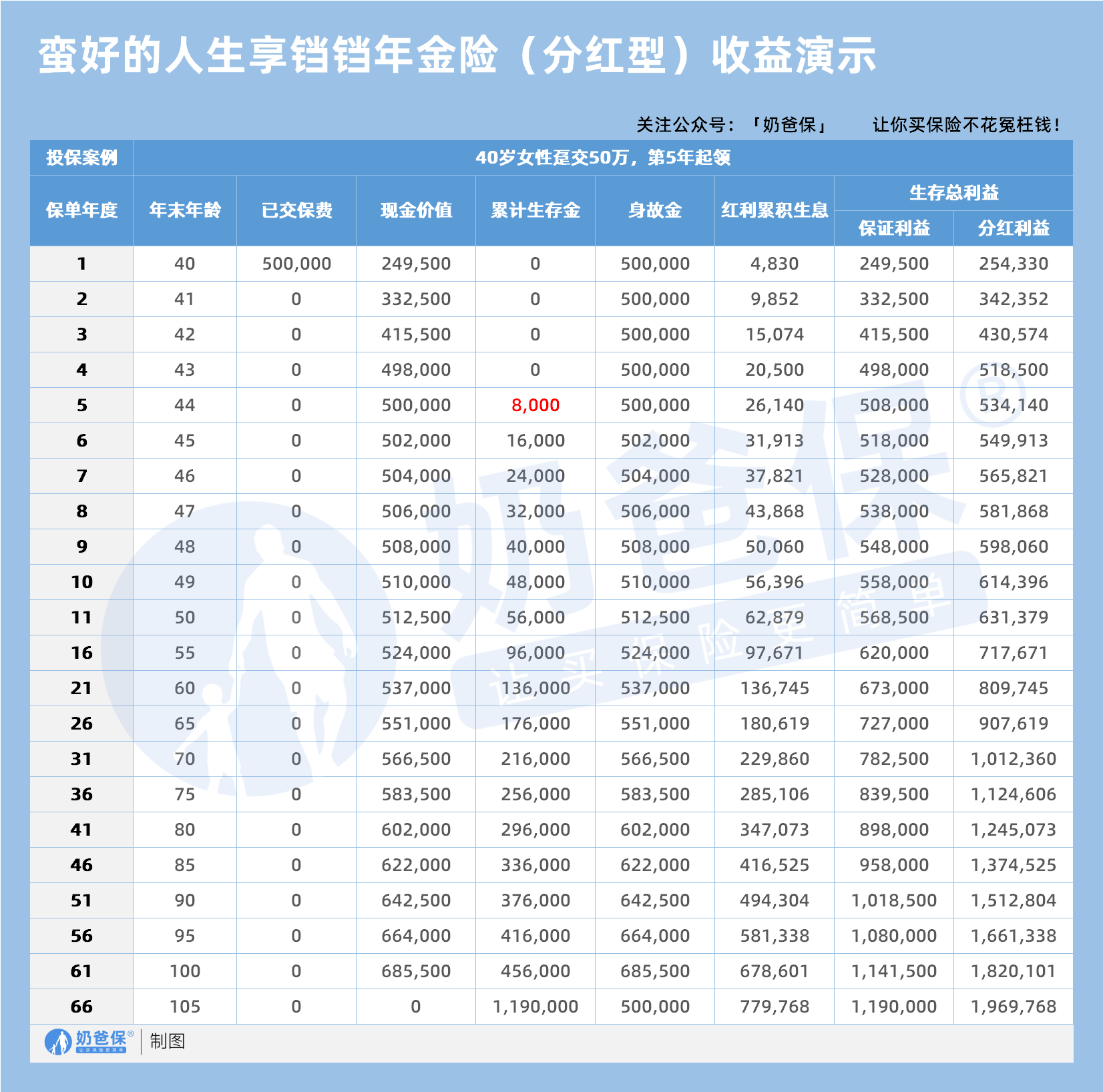 105岁时还可领50万的满期金,叠加累计生存金后总利益达119万。