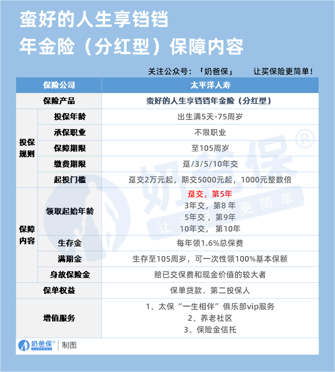 3年交第8年起领、5年交第9年起领、10年交第10年起领,适合工资稳定分批投入的上班族。