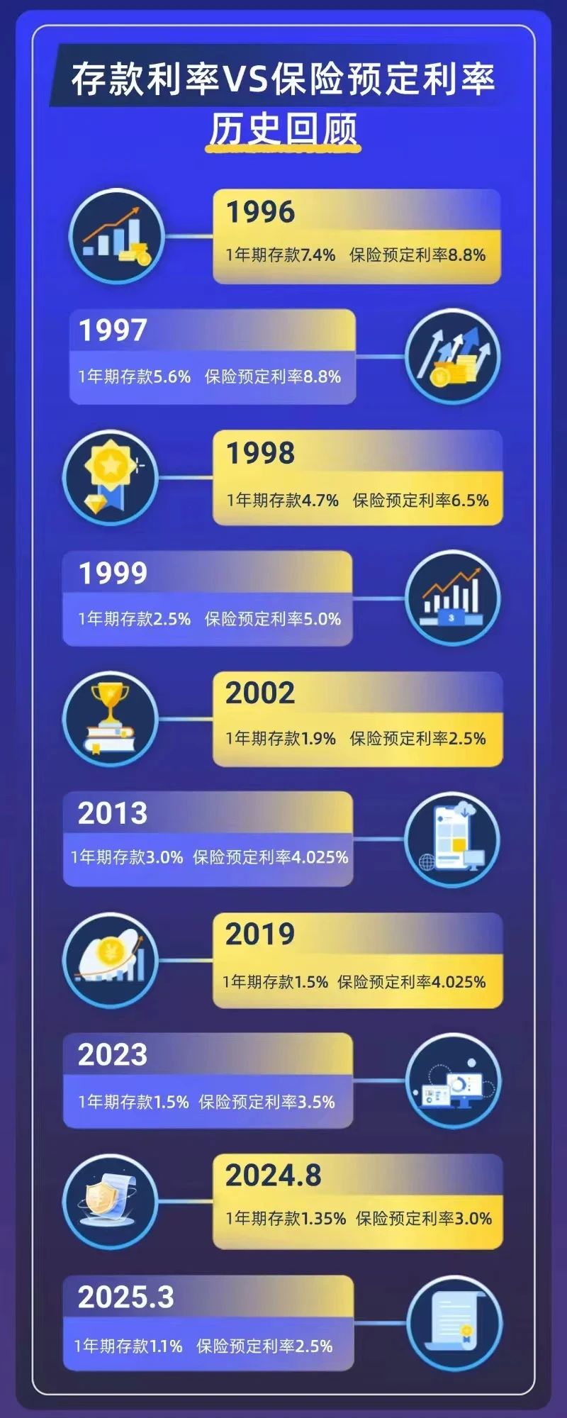 1996年,1年期存款利率7.4%,保险预定利率8.8%,那时候把钱放保险里,收益比存银行香。