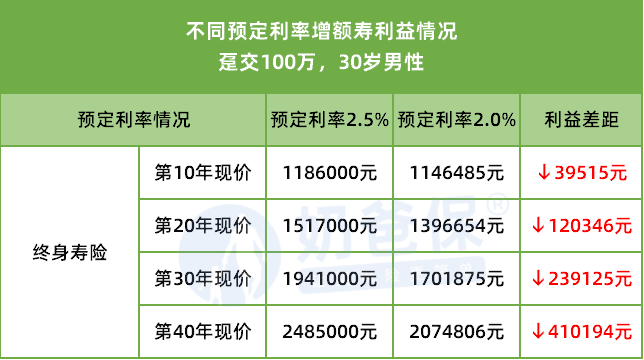 预定利率2.5%时,每年保费2800元;降到2.0%,要3612元,涨了29%