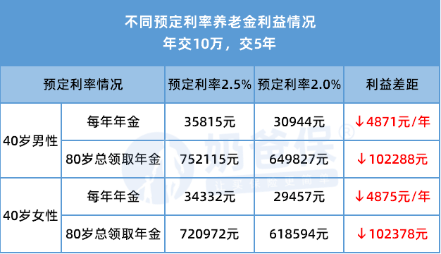 预定利率2.5%时,每年能领35815元;降到2.0%,每年只能领30944元,一年少领4871元。
