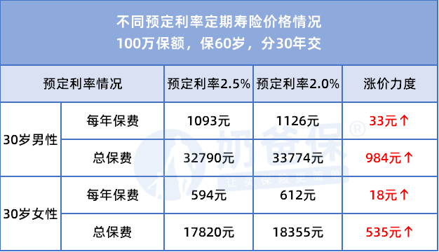 预定利率2.5%时,每年保费1093元;降到2.0%,每年要1126元,涨了33元。