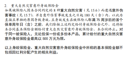 还有重大自然灾害意外身故保障,为75岁前因8种特定重大自然灾害遭受意外事故并导致身故的客户提供额外的保障,最高赔付金额达500万元。