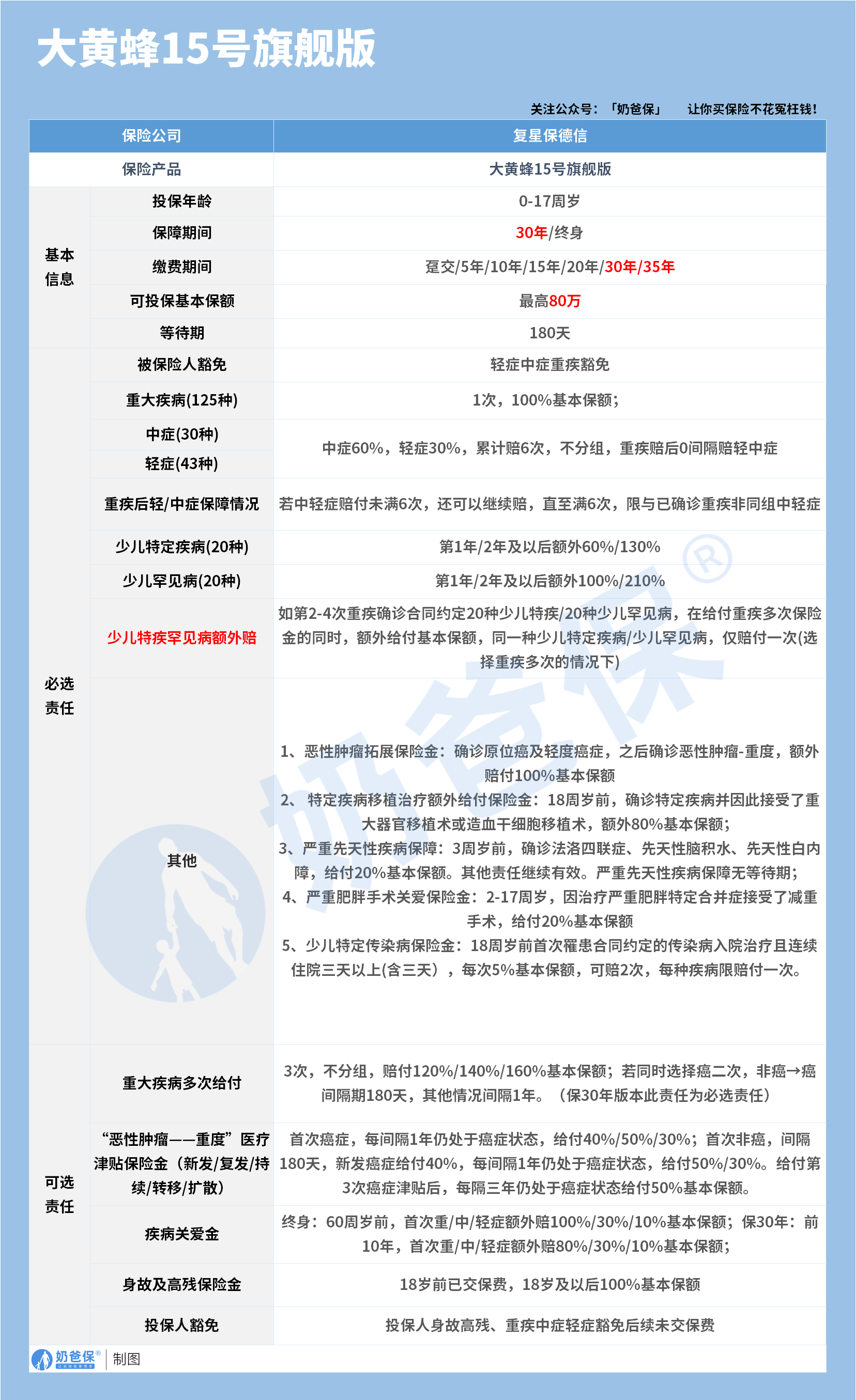大黄蜂15号旗舰版的少儿特定/罕见重疾多次赔付以及癌症无限次赔付等可选责任,便能很好地契合需求。