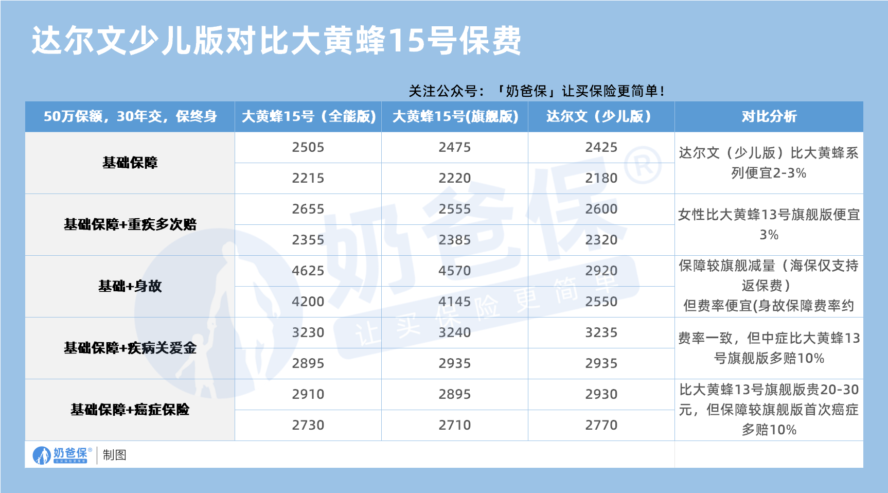 选达尔文少儿版:50万保额,30年交,保终身,每年2425元。