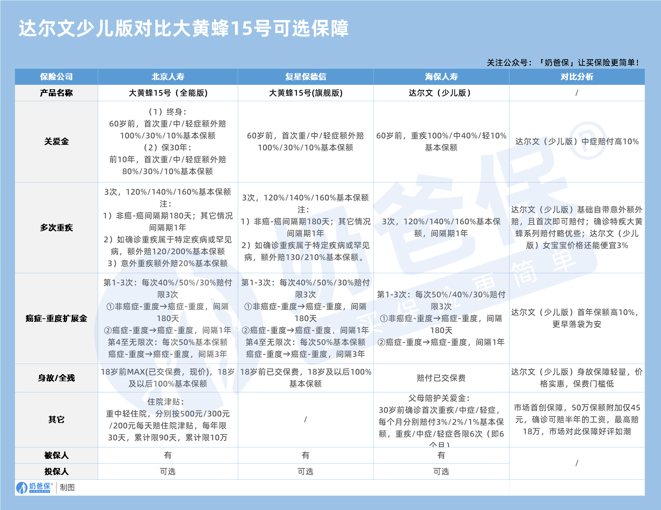 市面上热门的少儿重疾险里,达尔文少儿版和大黄蜂15号(分旗舰版和全能版)经常被拿来比。