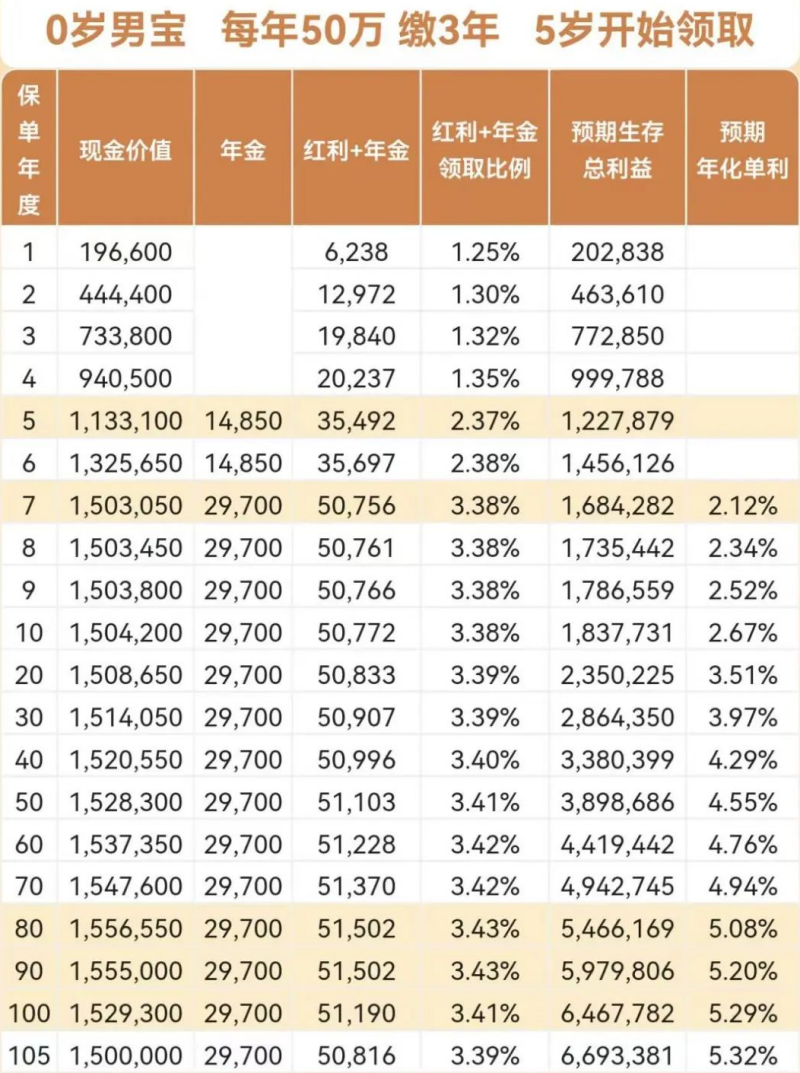 奶爸用“0岁男宝,每年交50万,交3年,5岁开始领,分红选现金领取”为例,看看钱咋“生钱”: