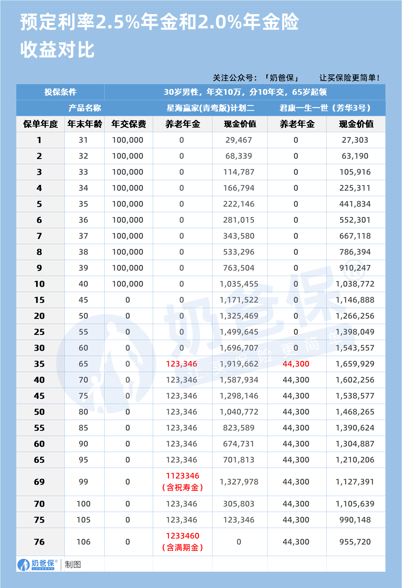 预定利率2.5%的产品每年能领123346元,这可是2.0%年金险每年44300元领取金额的近2.8倍。