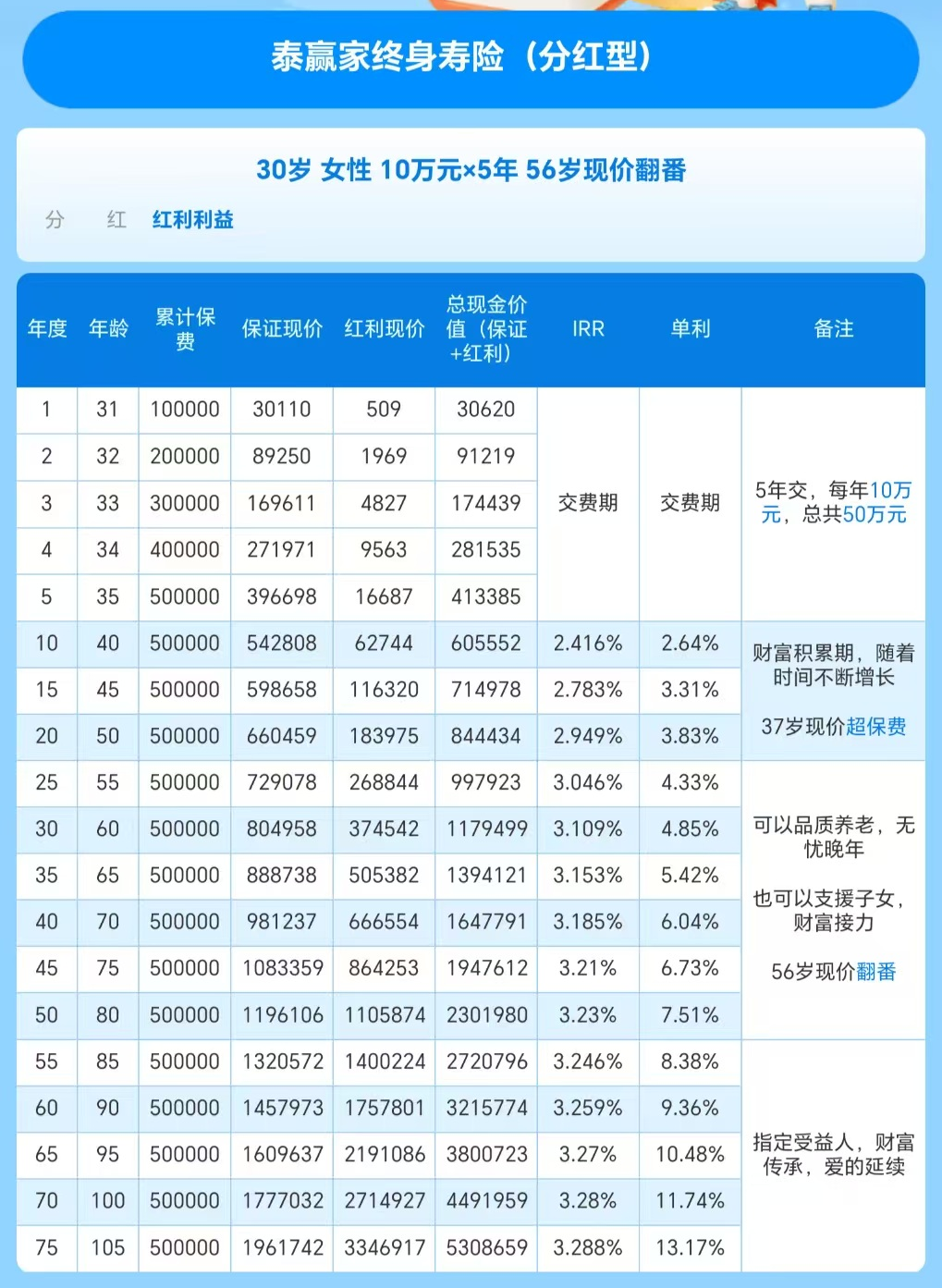 以30岁女性,年交10万,交5年为例子。