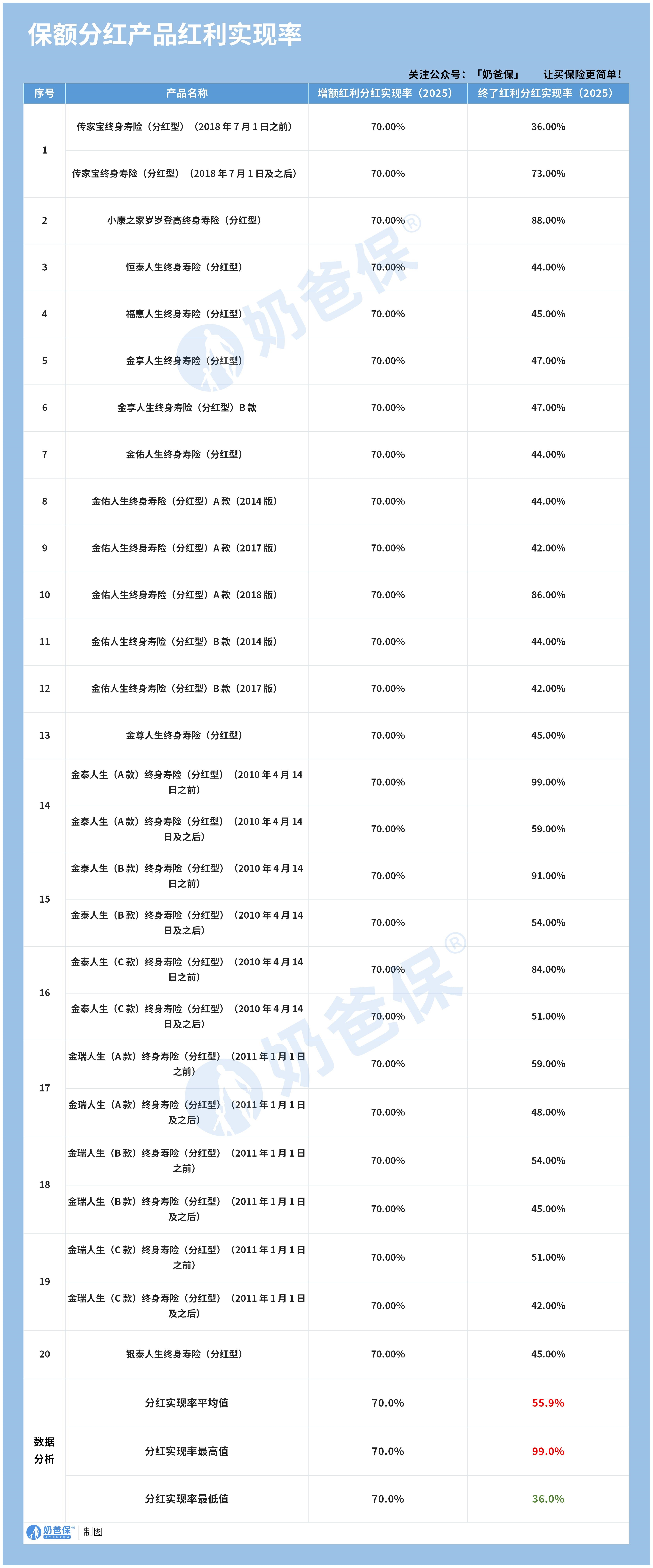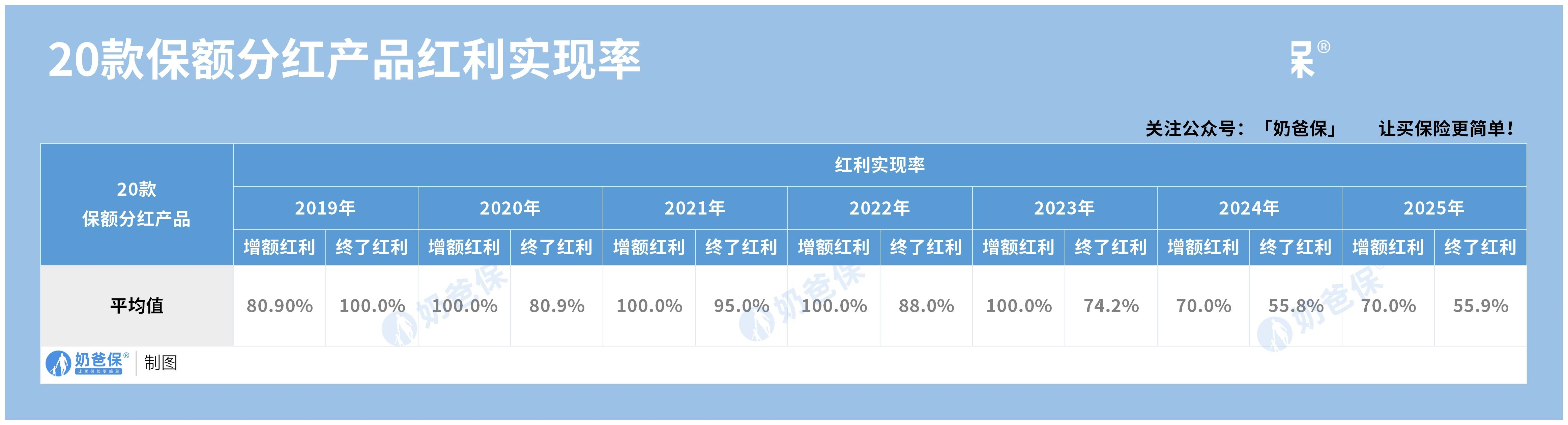 20款保额分红产品中,增额红利早年都是100%,2024-2025年降到70%,但整体稳定;