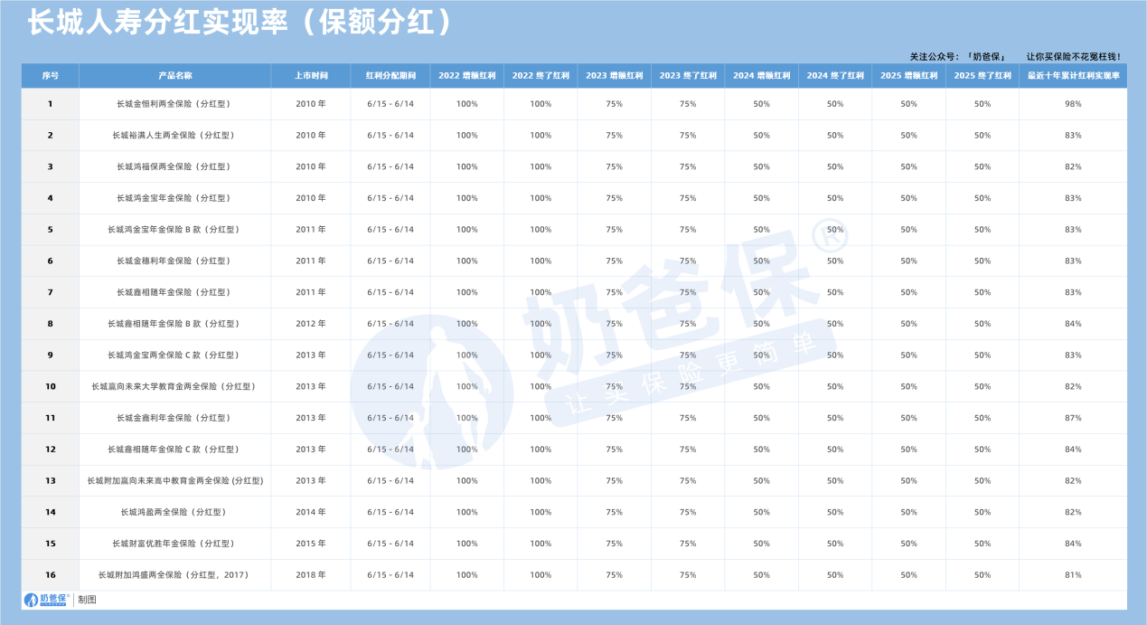 其中,2025年3月上市的“长城居庸关吉庆版两全保险(分红型)”实现率最高,达137%,其余16款产品的实现率均为100%