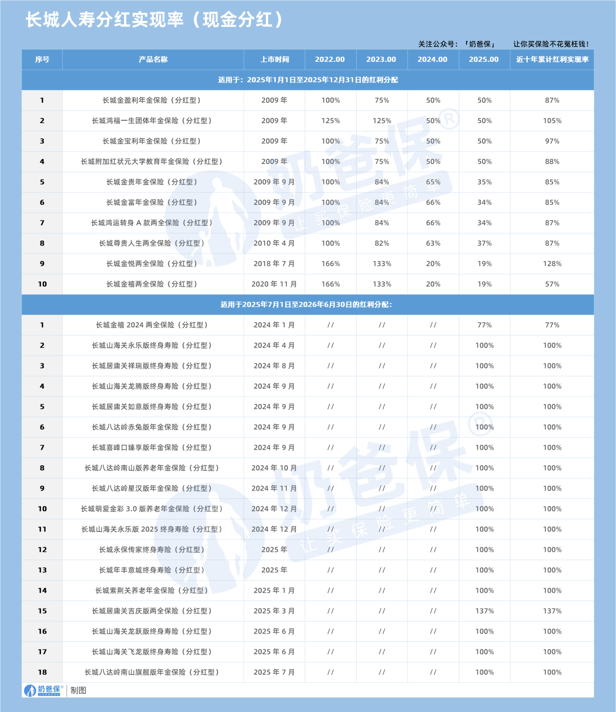 1-7款属于“2.5%预定利率+分红”的产品,8-18款则是2023年10月预定利率下调后推出的新产品,目前仅公布了2025年一年的分红实现率数据。