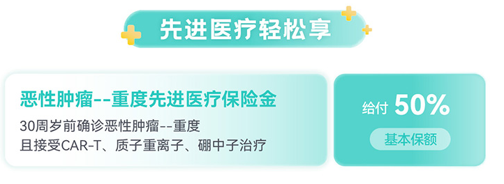 30岁前,确诊癌症重度且接受特定疗法,额外赔50%保额,赔1次。
