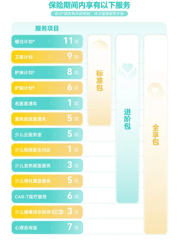 标准包(保额<30万)、进阶包(30万≤保额<50万)和全享保(保额≥50万)。