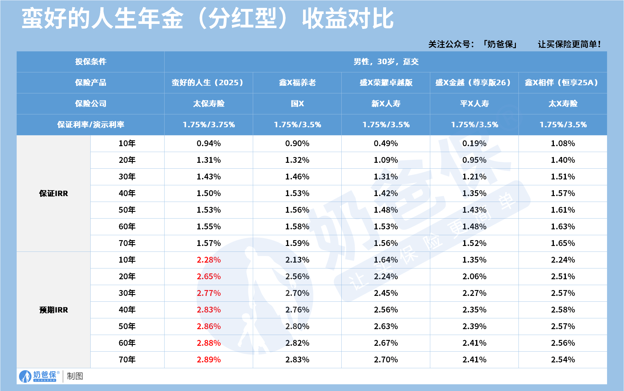 加上分红收益之后,在预期IRR方面,蛮好的人生2025(分红型)的优势就凸显出来,