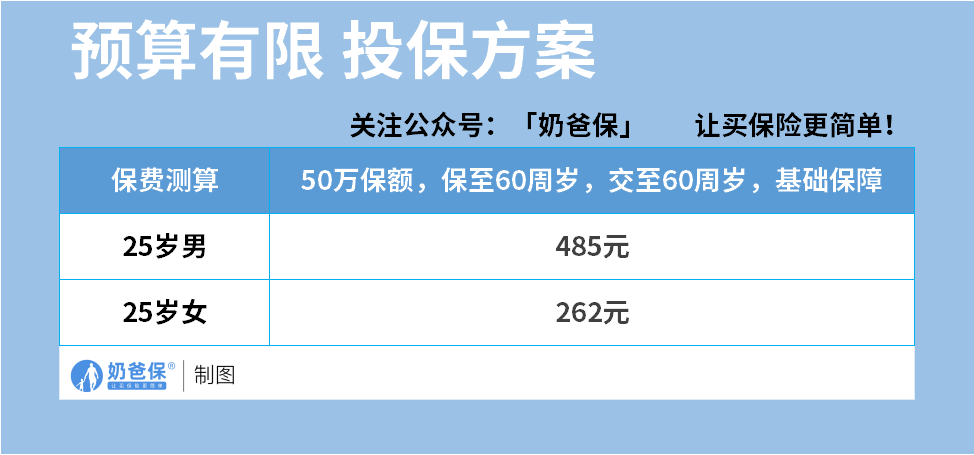 刚出社会、或者预算不多的情况下,可以先买个50万保额的基础保障: