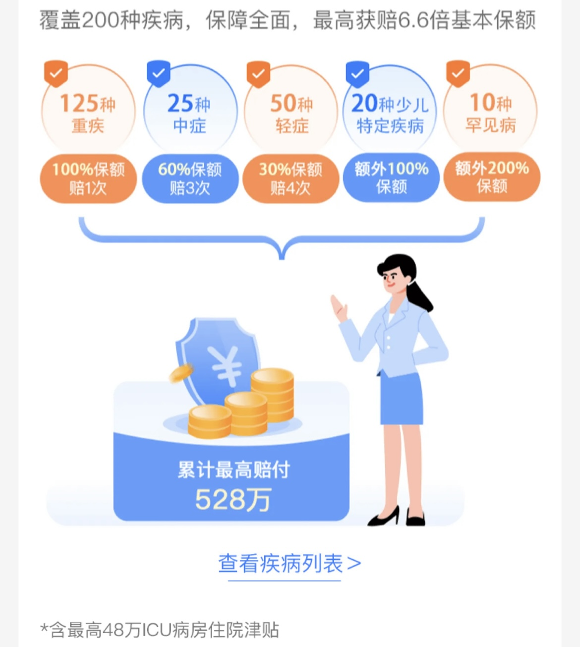 基础保障全面覆盖了重疾、中症和轻症,分别涵盖125种重疾、25种中症和50种轻症。