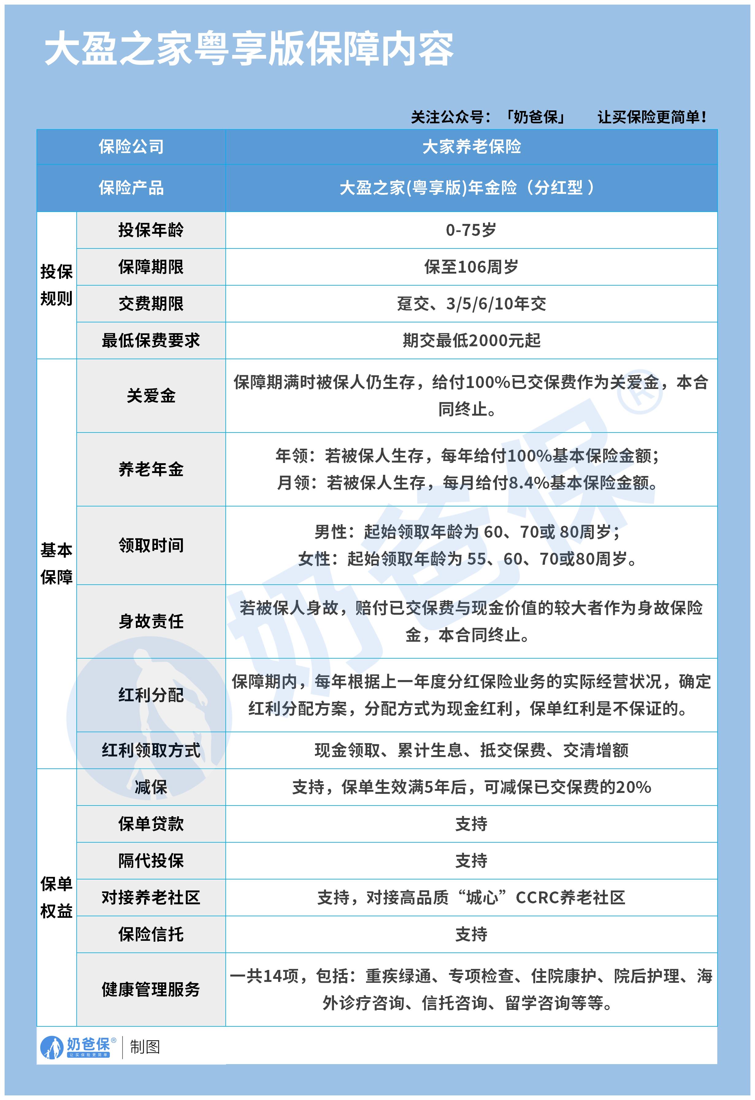 在众多年金险产品中,奶爸推荐大家养老大盈之家(粤享版)年金险(分红型)。