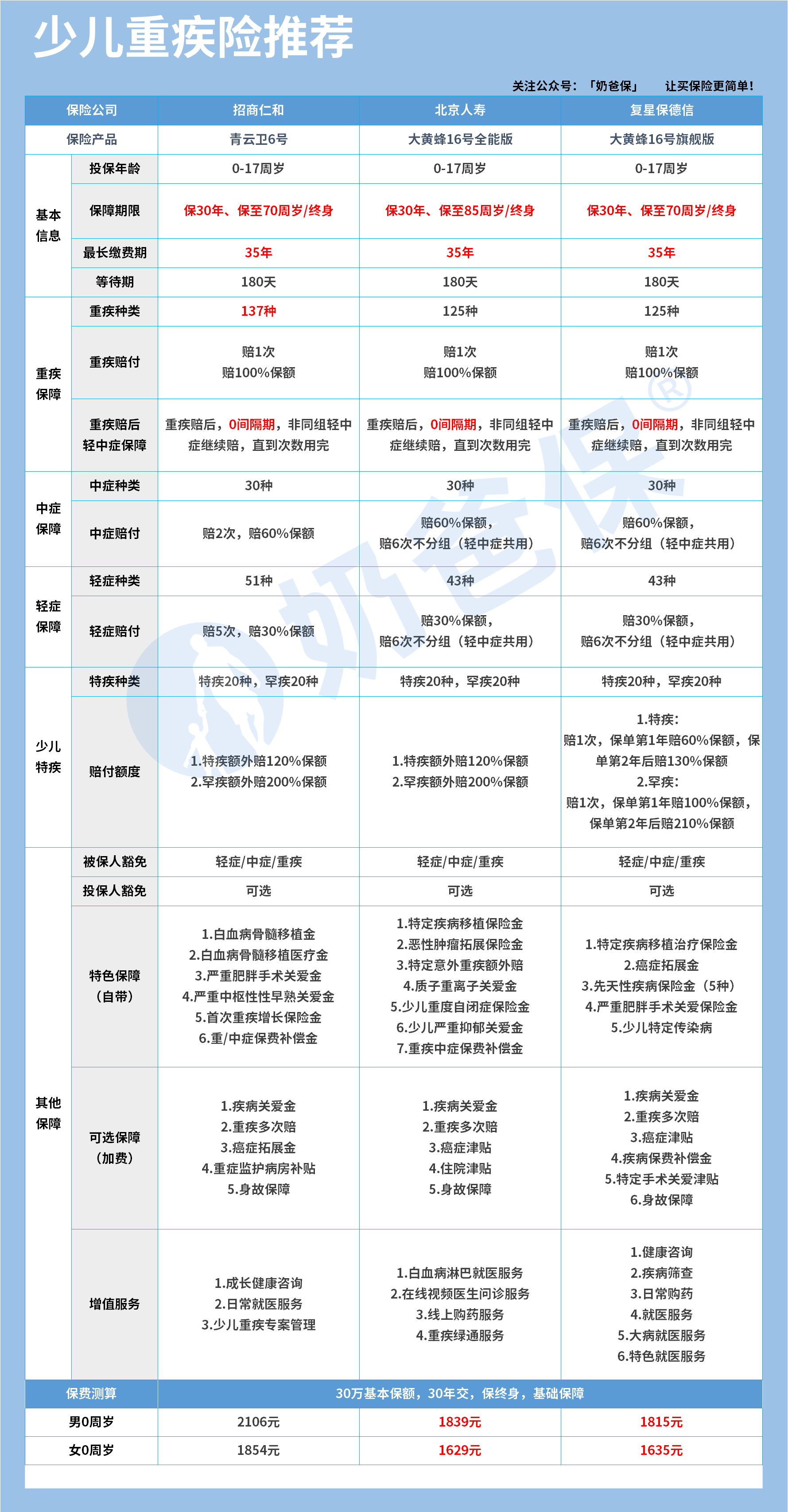招商仁和青云卫6号、北京人寿大黄蜂16号全能版、复星保德信大黄蜂16号旗舰版这三款,都是专门为少儿设计的好产品。