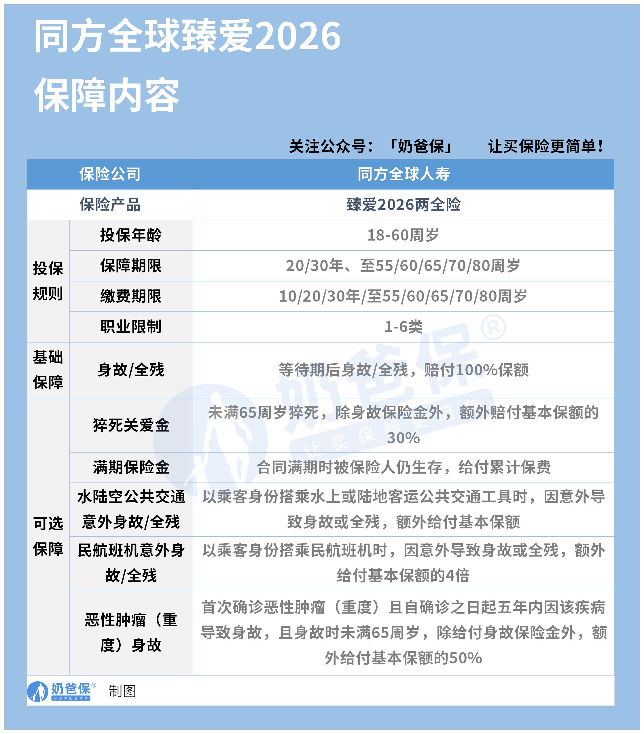 同方全球「臻爱2026」两全保险,既提供基础的身故和全残保障,又增加了很多符合现代人需求的可选责任,兼顾全面和灵活。