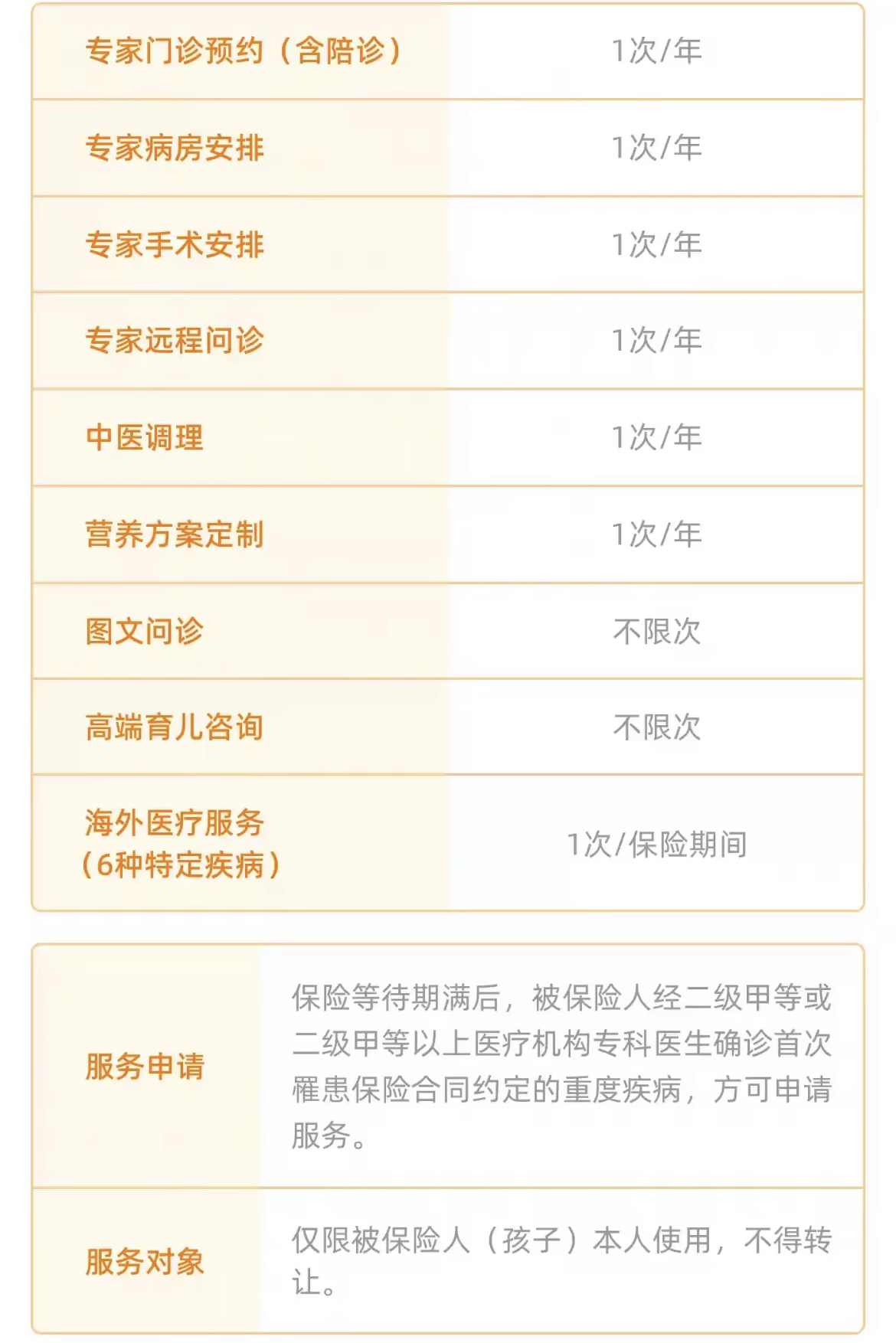这款产品配套多项增值服务,覆盖就医资源协调、健康管理及育儿咨询等场景,为家长提供更多辅助支持。